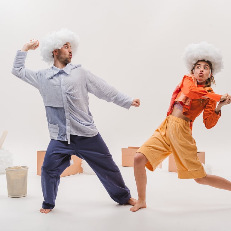 Con la cabeza en las nubes es un espectáculo sin texto destinado a público infantil y familiar que nos habla sobre los adultos que olvidan que fueron niños, y plantea un lugar donde jugamos, jugamos mucho desde el principio hasta el final. Exploramos qué ocurre cuando aparece nuestro niño interior y hasta qué punto lo controlamos… ¿o es él quien nos controla a nosotros?